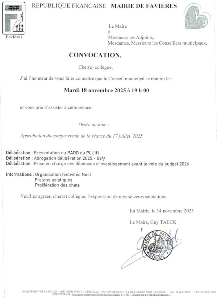 Nous venons de recevoir la convocation, le prochain Conseil Municipal aura lieu le mardi 18 novembre 2025, à 19H00. Encore une fois, la majorité municipale convoque au dernier moment puisque le délai minimum est de 3 jours francs.