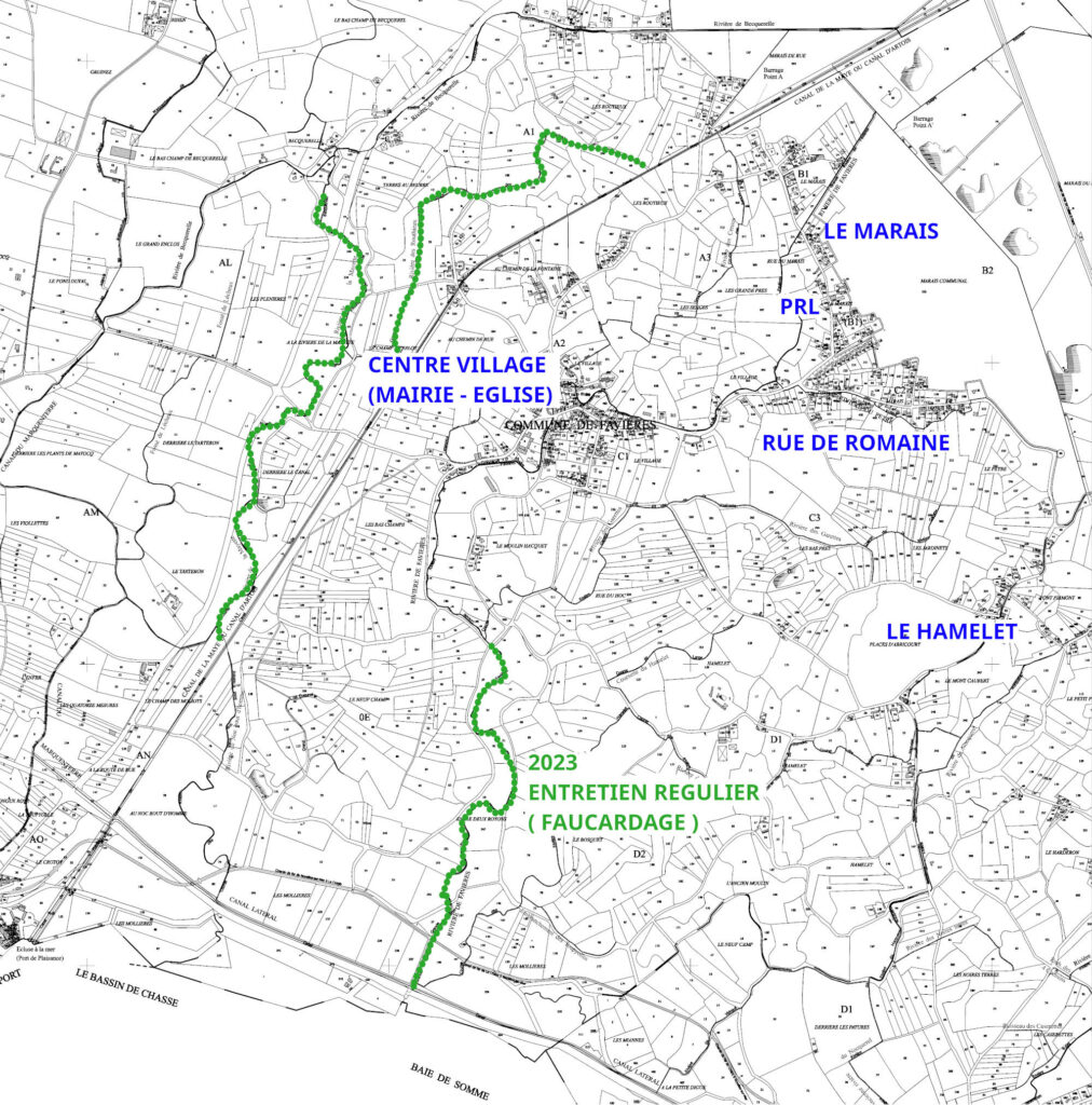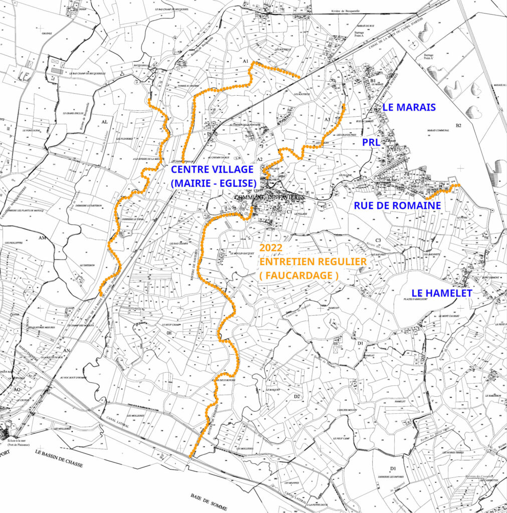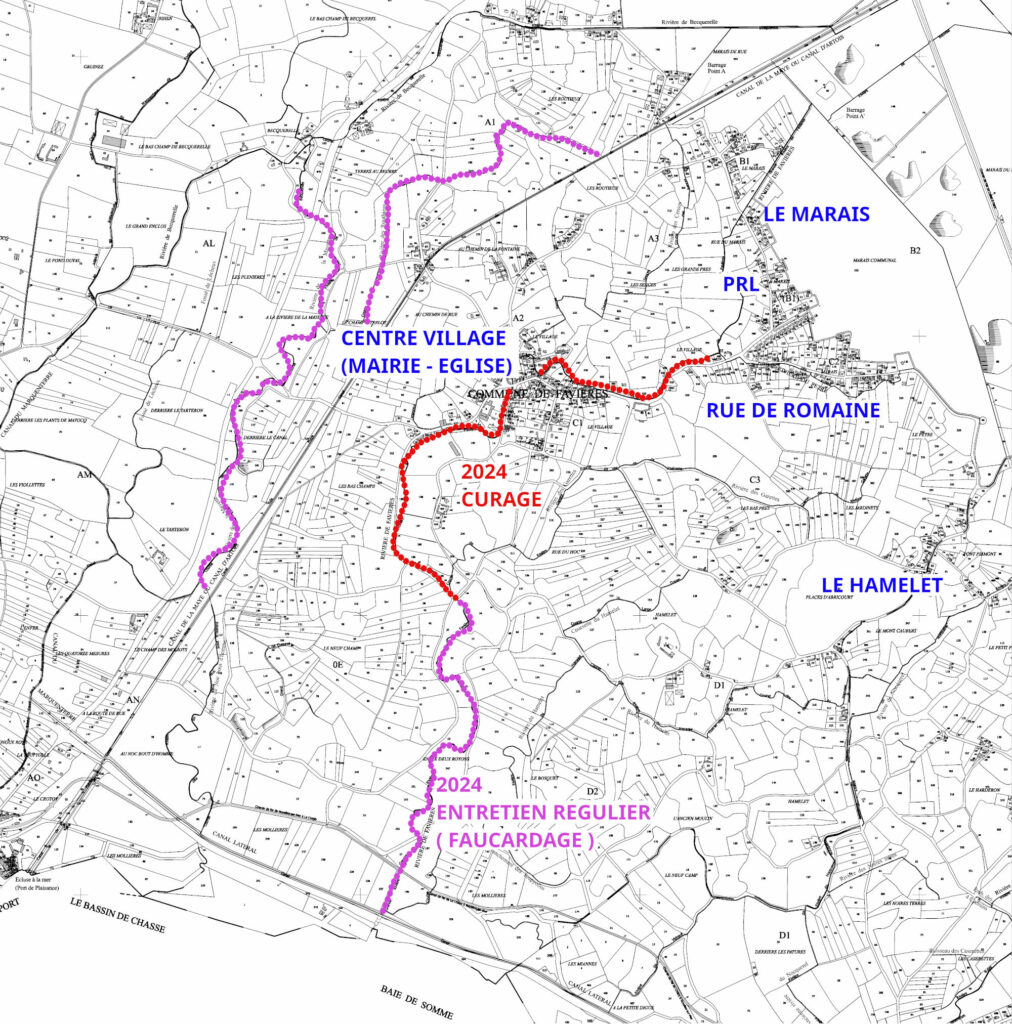- Rivière de Favières sur 3 200 mètres linéaires : en rouge le curage, en fushia le faucardage.