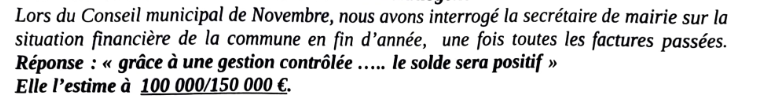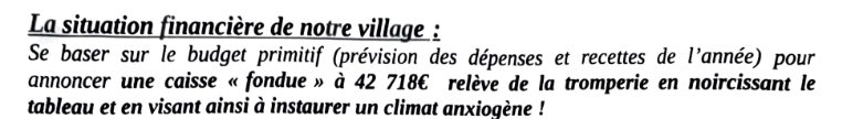 Quand Jean-Matthieu vote contre un budget, l’interprétation qu’ils en font est tout autre : cela devient selon eux une volonté de « mettre la commune sous tutelle »… Alors, quelle était la volonté de Mme SOHET en 2023 ?