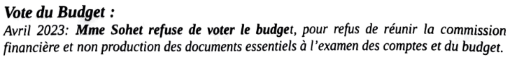 Nos contradicteurs citent le refus de Mme SOHET de voter le budget d’avril 2023. Voilà qui est courageux et appréciable, et les raisons sont valables.